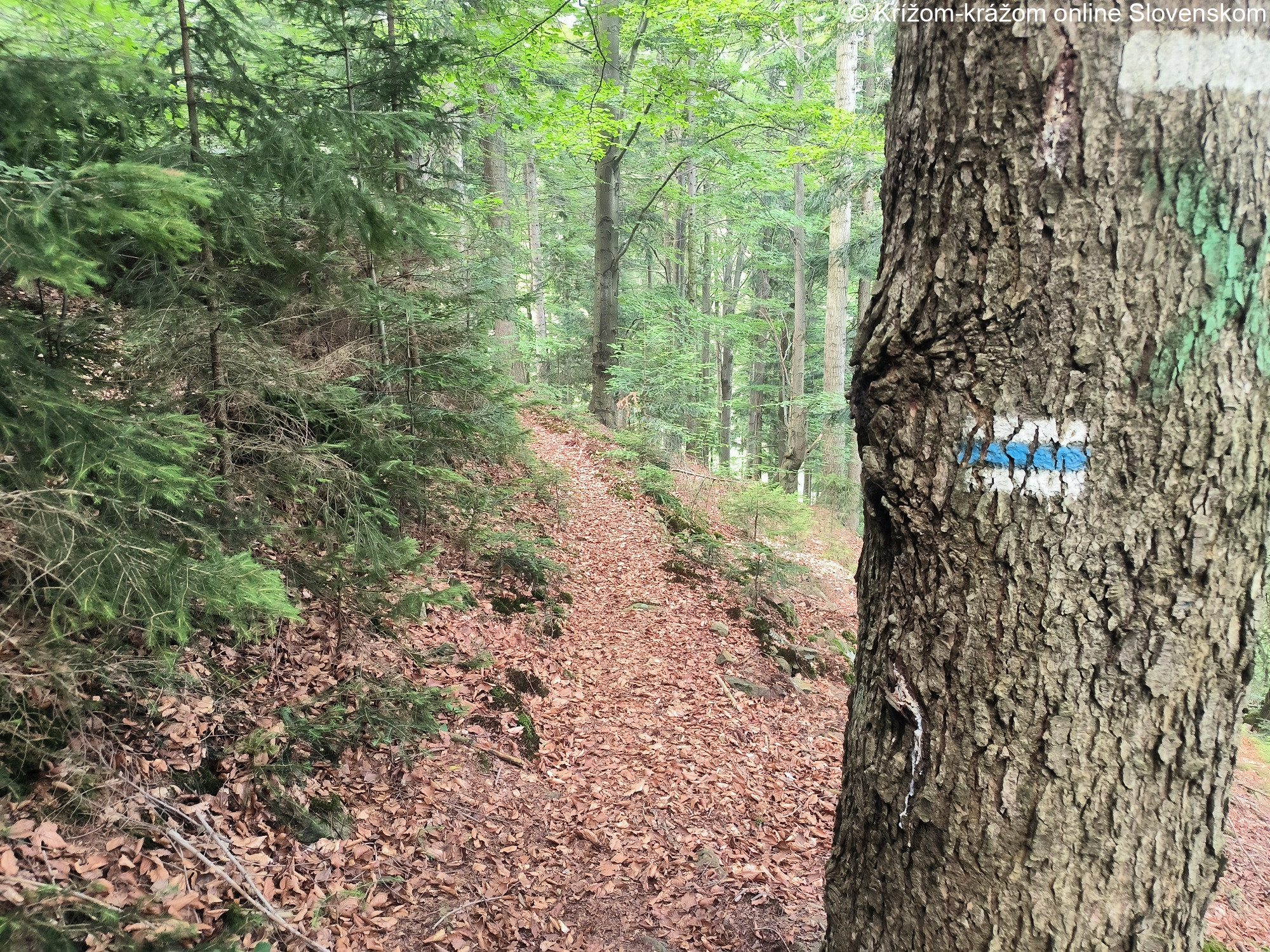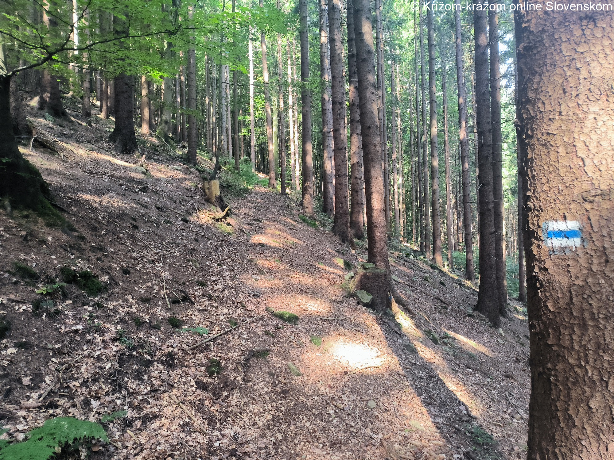 Priebeh a zaujímavosti chodníka: Modro značený chodník začína na železničnej zastávke Nosice. Pokračuje po priehradnom múre vodnej nádrže Nosice, prechádza Nimnicu-Kúpele a ponad obec Nimnica stúpa na vrch Holíš (533,2m), odkiaľ sú zaujímavé výhľady na vodnú nádrž Nosice a okolité pohoria, najmä Javorníky. Po strmšom klesaní z vrcholu Holíša, zaisteného lanami a reťazami, prichádza chodník na lúky v sedle Zábavy, kde ho križuje žltý chodník (8581) z Púchova do Udiče a Považského Podhradia. Modrý chodník poľnými a lesnými cestami pokračuje striedavo klesaním a stúpaním popod Upohlavskú skalu a Upohlavský diel (591,3m) hrebeňom medzi Hoštinou a Klieštinou smerom na vrch Sliškovec (511,7m) a do lokality Diel. Odtiaľ pokračuje stále striedavo klesaním a stúpaním lesom na vrch Široké (771,1m) a odtiaľ klesá do sedla Kýčera. Tu sa pripája zelený chodník (5582), po ktorom je možné zísť do Záriečia. Modrý chodník pokračuje klesaním cez osadu U Vlčka, za ktorou sa opäť strieda klesanie a stúpanie, ktoré sa neskôr mení na stúpanie popod vrchol Zigova (893,2m) a následne klesanie do sedla Zigov. Odtiaľ miernym klesaním schádza do lokality Nad Končinou. Tu sa pripája žltý chodník (8589), po ktorom je možné prísť do osady Repovci v Kátline. Modrý chodník dosť prudko klesá do Hornej Marikovej, miestna časť Modlatín. Ak chceme, z Hornej Marikovej môžeme po ďalšom žltom chodníku (8692) vystúpiť do sedla Orgoňova Kýčera a z neho na vrch Orgoňova Kýčera (959,8m). Modrý chodník prechádza okrajom Hornej Marikovej a pokračuje stúpaním po lesných cestách pod hrebeň, pod ktorým pokračuje takmer po rovine, až kým neklesne do miestnej časti Stolečné. Na tomto úseku chodníka je niekoľko pekných výhľadov na Javorníky, prameň a chodník prechádza popod skalný útvar Medvedia skala. Nad osadou Stolečné prudším stúpaním prichádza na hlavný hrebeň Javorníkov, kde pri chate Portáš končí. Od hotela je možné pokračovať po hrebeňovom červenom chodníku do strediska Kohútka alebo opačným smerom na Malý Javorník (1.019,2m).