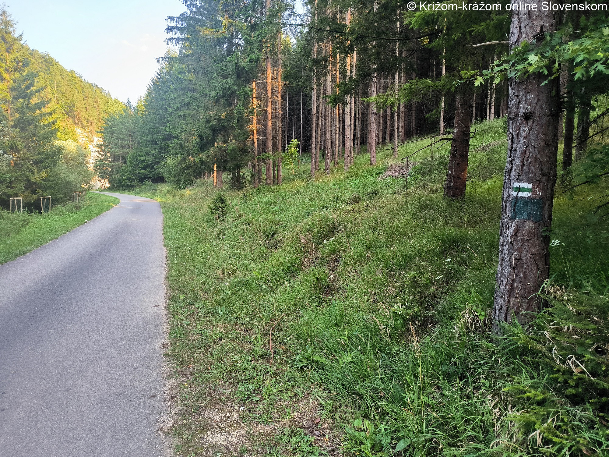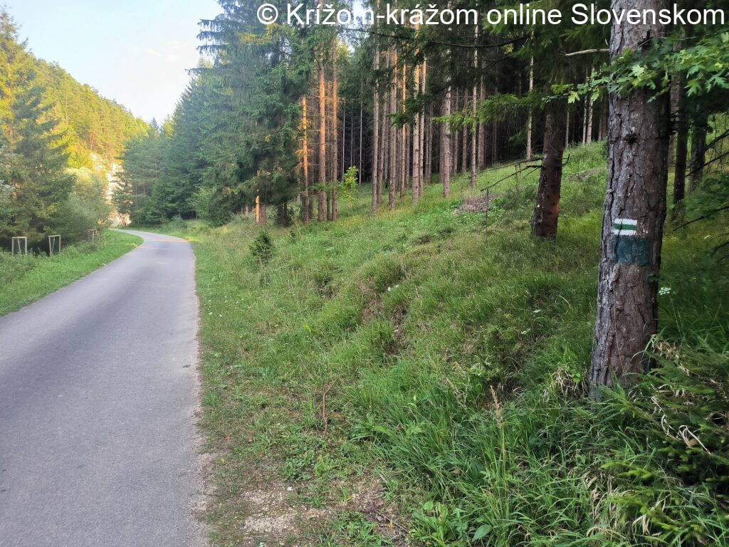 Priebeh a zaujímavosti chodníka: Chodník začína na železničnej stanici v Považskej Bystrici. Pokračuje ulicami mesta smerom na Rajec, pritom prechádza okolo pamätníka SNP. Na kruhovom objazde pod diaľnicou križuje žltý chodník (8580). Po žltom chodníku je možné pokračovať do Milochova alebo do chatovej osady v Manínskej tiesňave. Zelený chodník pokračuje cez stred mesta a po hlavnej ceste smerom na Rajec prichádza do lokality Čierne háje. Tu odbočuje z hlavnej cesty doprava a začína stúpať. Prechádza cez obchvat sídliska Rozkvet, prechádza okolo garáží, a za nimi vchádza do lesa. Miernym stúpaním pokračuje okolo vodárne a popod vrch Žadovec (457,5m). Následne pokračuje po hrebeni, vychádza z lesa na lúku a klesá do mestskej časti Horný Moštenec. Stúpa obcou a okolo Kostola svätého Cyrila a Metoda pokračuje stúpaním do sedla medzi Horným Moštencom a Podskalím, kde sa nachádza kríž. Zo sedla schádza do Podskalia, pričom po ľavej strane celú cestu vidieť Podskalský Roháč. Pred obcou prechádza ešte okolo jedného oddychového miesta s božou mukou. V Podskalí prechádza popod Kostol svätého Martina biskupa z Tours a prechádza obcou. Po asfaltovej ceste ďalej klesá okolo Kaplnky svätého Jána Nepomuckého do Dolného Lieskova, miestnej časti Tŕstie. Tu odbočuje na hlavnej ceste vpravo a pred Kaplnkou nanebovzatia Panny Márie vľavo. Po spevnenej ceste pokračuje okolo kameňolomu do lokality Riedka, na križovatku trás. Nad križovatkou sa južným smerom nachádza hradisko Mesciská a na rázcestí pamätník obetiam 2.svetovej vojny. Odtiaľto je možné pokračovať po modrom chodníku (2691) cez Mojtín do Zliechova. Zelený chodník stále po spevnenej ceste prechádza dolinou Radotiná, kde sa nachádza jaskyňa Babirátka. V lokalite Priedhorie je rázcestie trás, zelený chodník sa spája so žltým chodníkom (8582). Po žltom chodníku je možné pokračovať do Pružiny alebo opačným smerom do Čičmian a na Lazový vrch (856,2m). Oba chodníky majú spoločnú trasu až do lokality Pod Hrádkom, sútok potokov. Tu sa rozdeľujú a zelený chodník pokračuje doprava po spevnenej ceste stúpaním popod vrch Sokolie (1.032,4m) do lokality Červíková. Tu začína žltý chodník (8592), po ktorom je možné pokračovať okolo Strážovských vodopádov do sedla pod Strážovom. Zelený chodník pokračuje prudkým stúpaním krásnym lesným chodníkom do sedla pod vrchom Sokolie (1.032,4m). Odtiaľ pokračuje už klesaním po lesných a poľných cestách do Zliechova. Nad obcou sa spája najskôr s modrým chodníkom (2691), po ktorom je možné pokračovať cez Mojtín do lokality Riedka, a neskôr na hornom konci obce s červeným chodníkom (0801), ktorý odbočuje na lúku pod Strážovom a ďalej do Čičmian. Všetky tri chodníky pokračujú do centra Zliechova, kde zelený i modrý chodník končí. Po červenom chodníku (0801) je ešte možné pokračovať na vrch Vápeč (955,5m) a do Hornej Poruby.